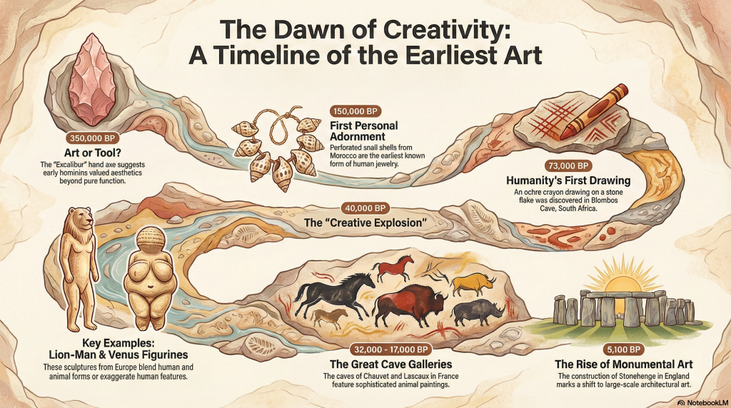 - The “Creative Explosion”: Around 40,000 years ago, a significant surge in artistic expression occurred, often termed the “creative explosion.” This period saw the flourishing of cave art and the creation of complex figurines. Artistic talent arose and, we believe, complex language abilities. The artistic changes can be seen in nearly 400 caves across Europe and Indonesia.