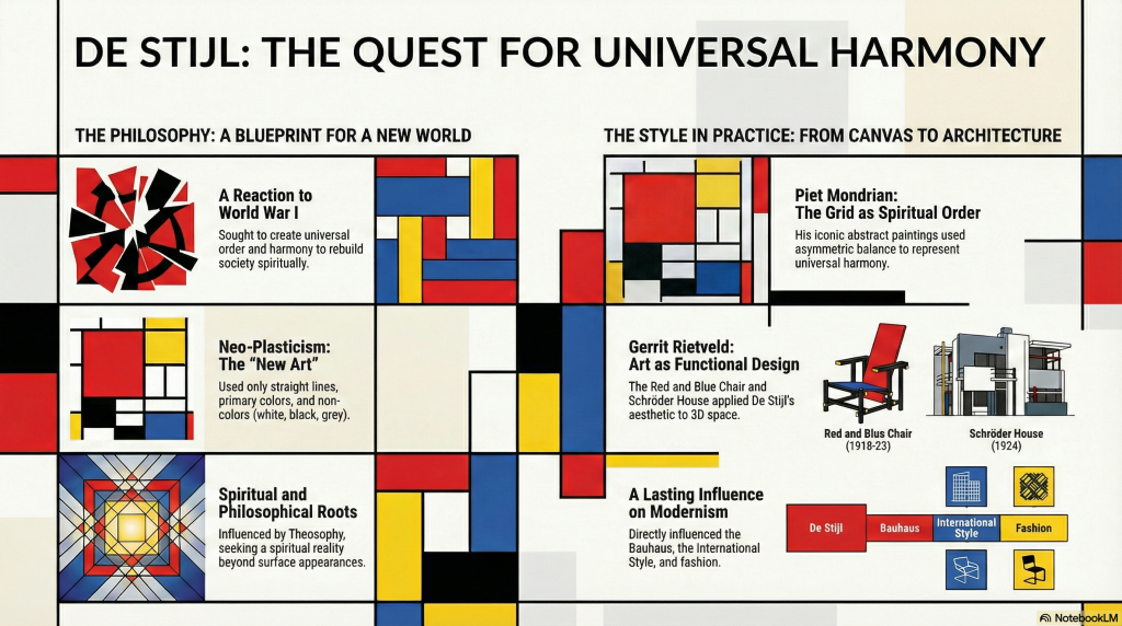 When we look at a painting by Piet Mondrian—a grid of black lines and primary colors—it can feel like a retreat into a void. In reality, it was a “spiritualized world order” born from the literal devastation of World War I. Mondrian, a lifelong member of the Theosophical Society, believed that art should act as a bridge to a divine principle. To reach this higher reality, he felt he had to “destroy” natural appearance.