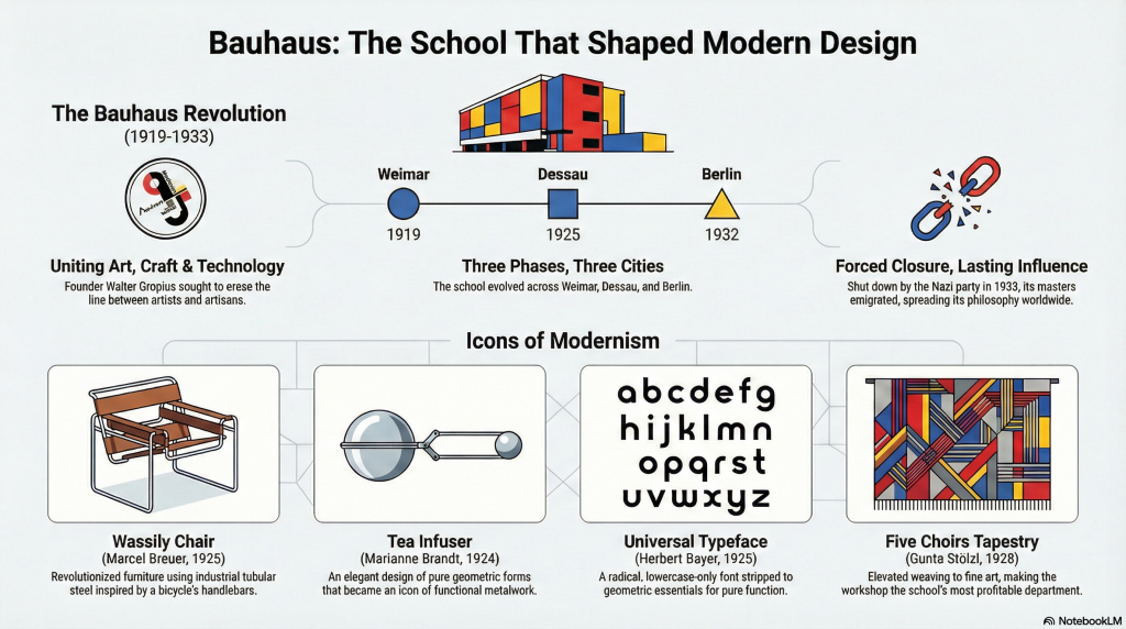 We live within the architectural echoes of a ghost. You see it in the shimmering, curtain-walled monoliths of our city centers, the geometric precision of the sans-serif fonts on your smartphone, and the skeletal steel frames of your office furniture. This ubiquitous aesthetic—the visual DNA of the 21st century—was forged in a radical institution that existed for a mere fourteen years. Between its founding in 1919 and its forced dissolution in 1933, the Bauhaus migrated across three German cities (Weimar, Dessau, and Berlin), surviving on a razor’s edge of political vitriol and financial instability. It remains the great paradox of design history: a school that lasted barely a decade, yet managed to dismantle centuries of ornate tradition to invent the modern world. We inhabit a “Bauhaus world” so completely that we have become blind to its radicalism, forgetting that our “less is more” reality was once a revolutionary battle cry.